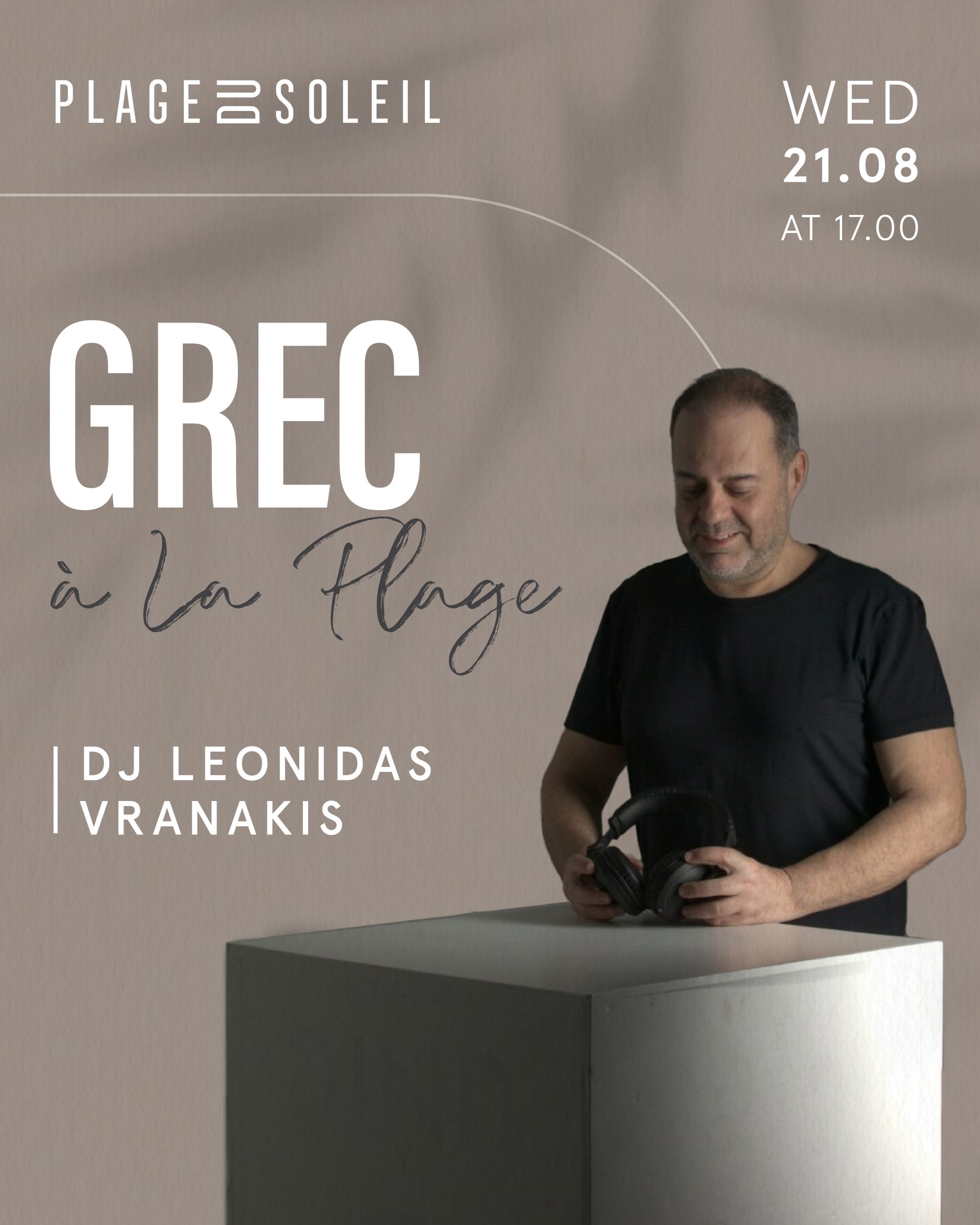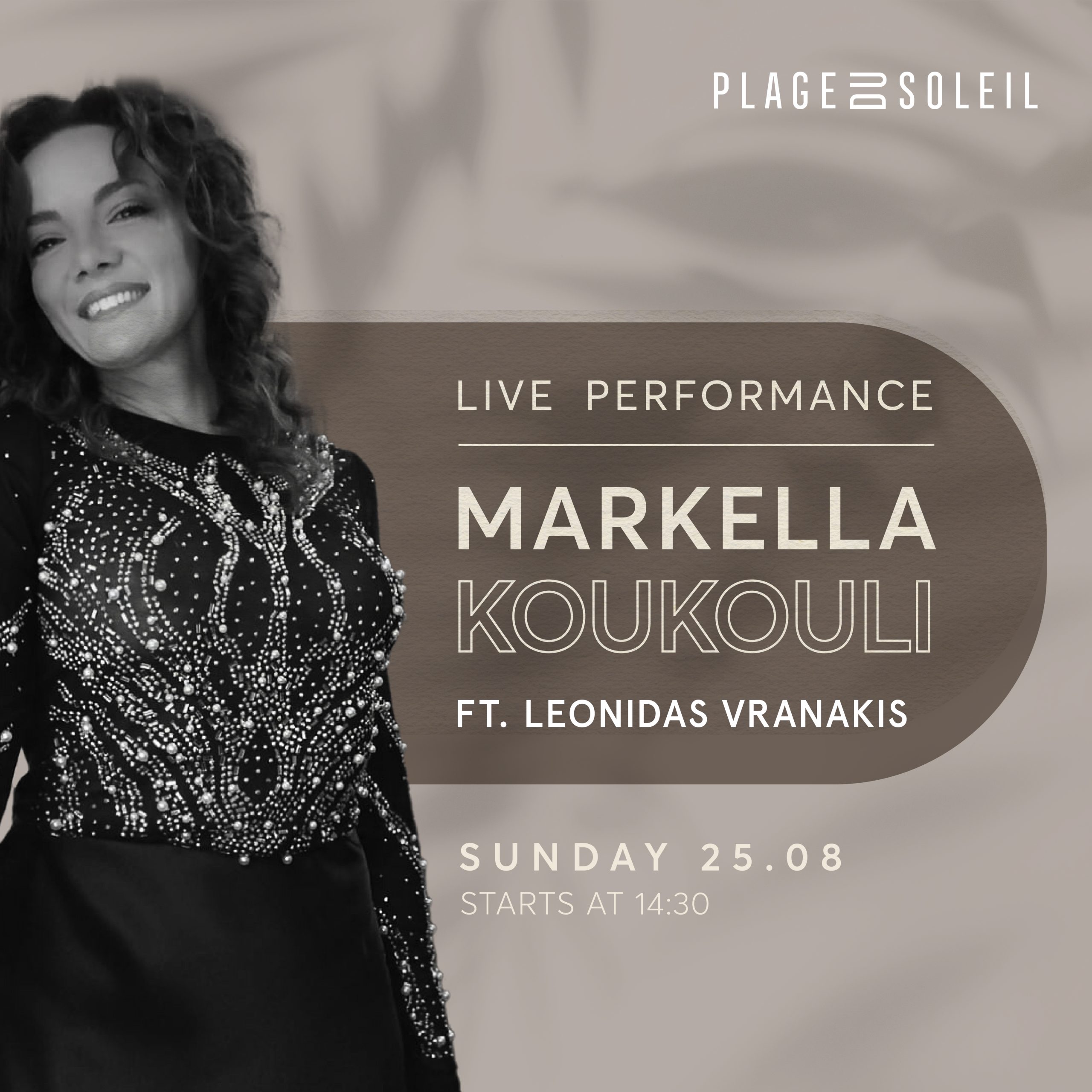 Join us at Plage Du Soleil for an afternoon of sun, sand, and fantastic music featuring Markella Koukouli and DJ Leonidas Vranakis!